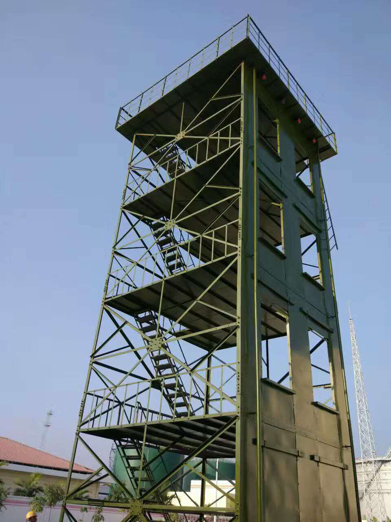 消防训练塔是一种露天的四柱钢结构架,其尺寸为5米*3米;其单层高度为3.5米,顶层高度为3米,一共为5层;在消防训练塔中主要包括楼角攀爬、消防竖井等项目;在消防训练塔的正面自第二层起,消防训练塔每层设有两个窗口,窗间距宽度为1米;创口的尺寸为1.2米*1.8米,窗口距离塔边的距离不小于0.65米,窗台为0.4米,每层窗台距离该地面的高度为0.8米,层高为3.5米,并且设有0.7米的内楼梯。在消防训练塔的末层内设置有不小于1.5米的宽平台,在顶层上设置有楼板;在消防训练塔外设有消防梯,梯直接达到塔顶,其距离地面的高度为3米,梯宽为0.5米。建设消防训练塔的时候,主要由模拟窗、楼层隔板、后骨架、瞭望、指挥平台骨架、以及主体钢结构框架等组成。在塔前设有八个模拟窗,上下相邻的模拟窗之间设有楼层隔板。在塔体的候补下方设有骨架;主体框架采用螺栓进行连接和组装;层与层之间设有楼梯进行连接,在塔体顶部还设有瞭望指挥平台;而且还可以根据用户的需求在塔体安装测风仪、凉水带架和警报器等,在整个消防训练塔的钢结构框架上,还应做好防腐和防火措施。